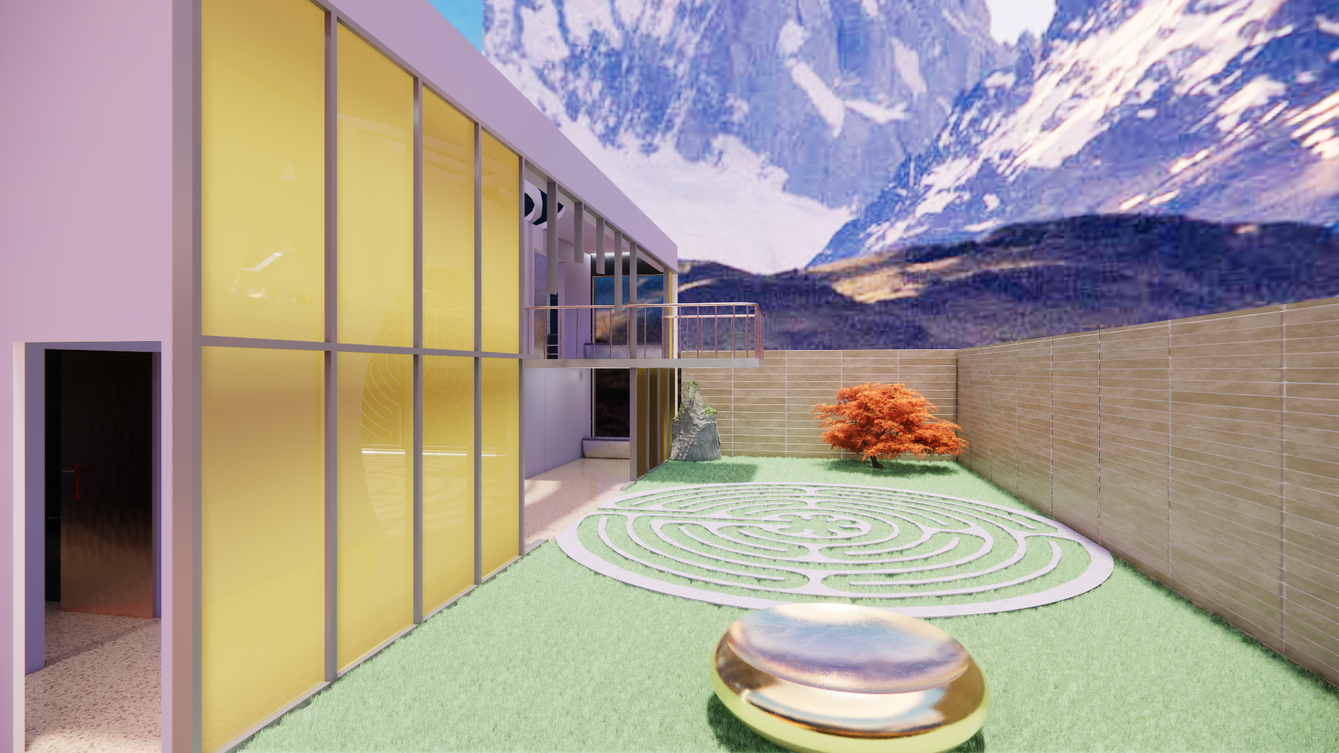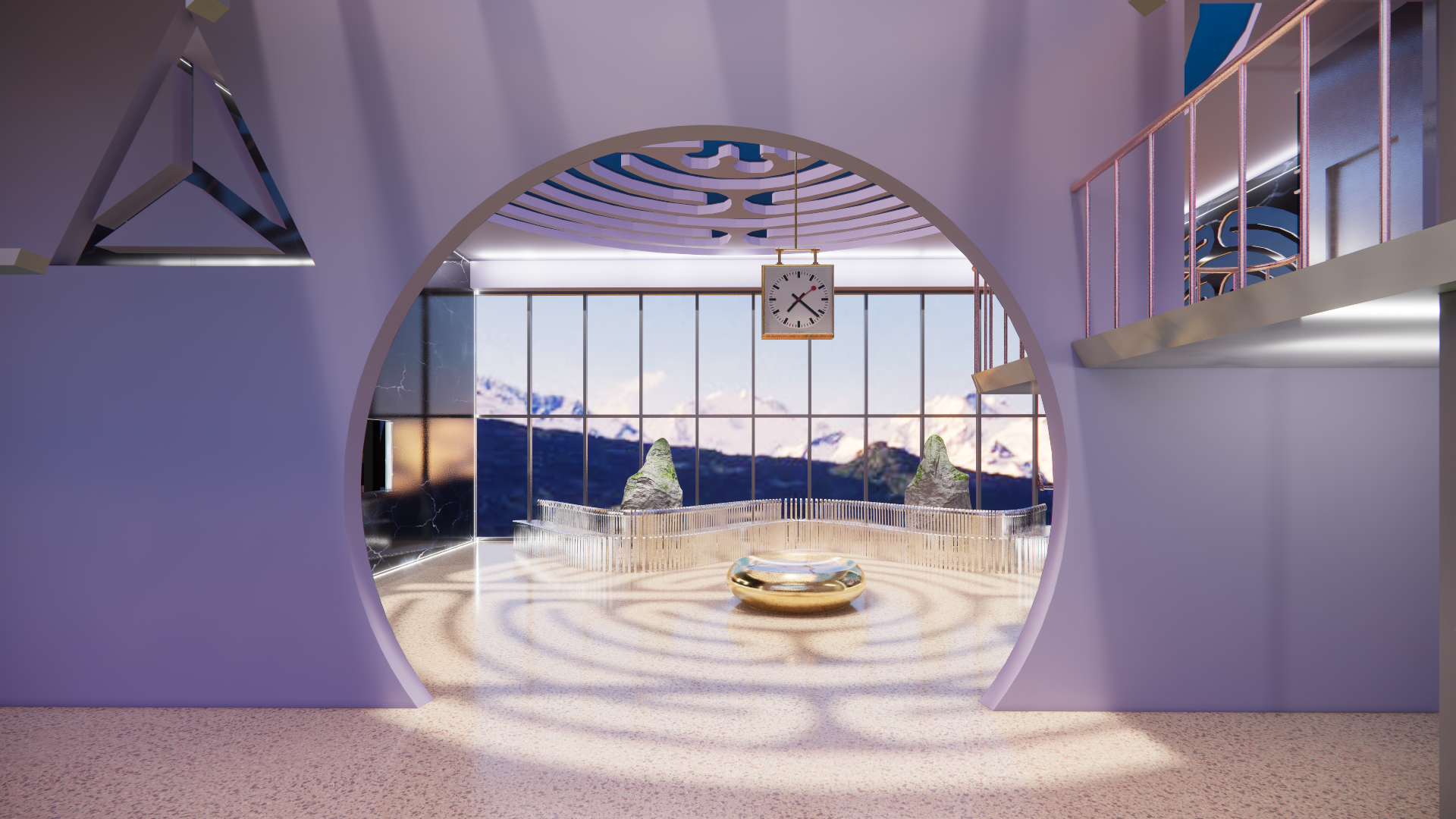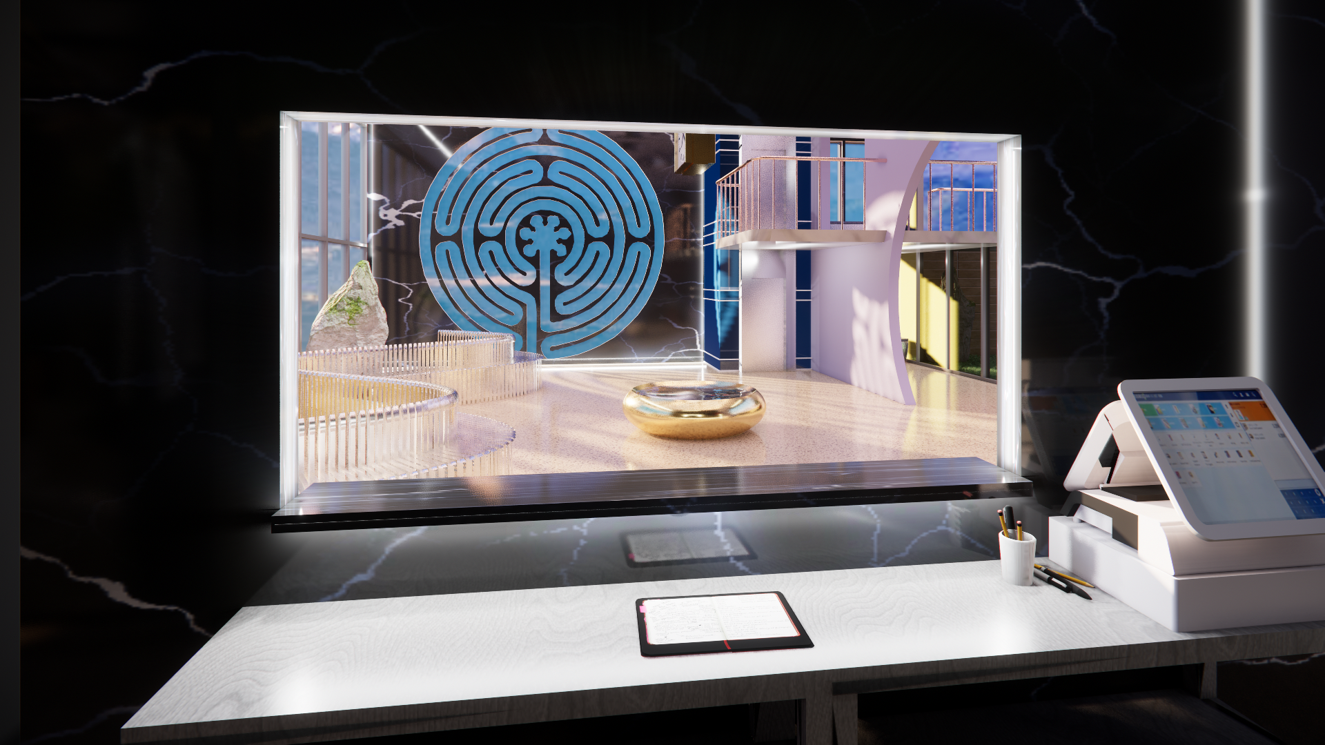 This conceptual work asks us to think about places and spaces where we can find a moment of serenity and connection to ourselves. “The Labyrinth’s Waiting Room” provides visitors with an opportunity to walk a labyrinth in the outdoor space and/or take a seat inside. The outdoor space takes cues from Japanese gardening. The inside space is inspired by a waiting area in the renovated Moynihan Train Hall. Visitors are encouraged to think about waiting not as an uncomfortable in-between state, but rather as the point. In the silence, a clock reminding us that time will never wait, we can find a moment of pause.