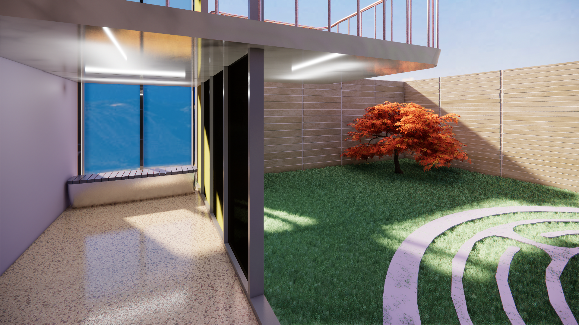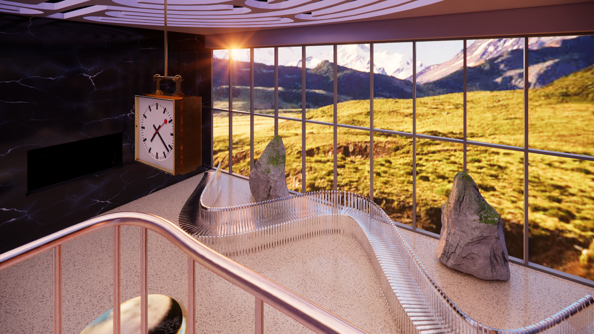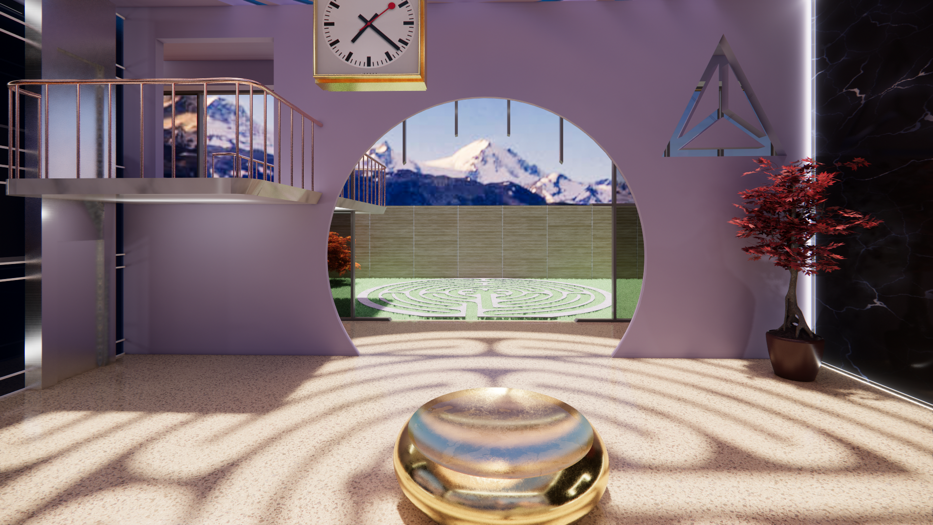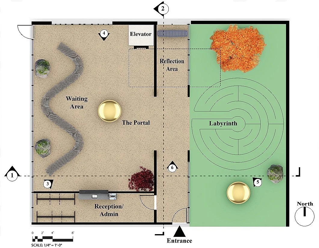This conceptual work asks us to think about places and spaces where we can find a moment of serenity and connection to ourselves. “The Labyrinth’s Waiting Room” provides visitors with an opportunity to walk a labyrinth in the outdoor space and/or take a seat inside. The outdoor space takes cues from Japanese gardening. The inside space is inspired by a waiting area in the renovated Moynihan Train Hall. Visitors are encouraged to think about waiting not as an uncomfortable in-between state, but rather as the point. In the silence, a clock reminding us that time will never wait, we can find a moment of pause.