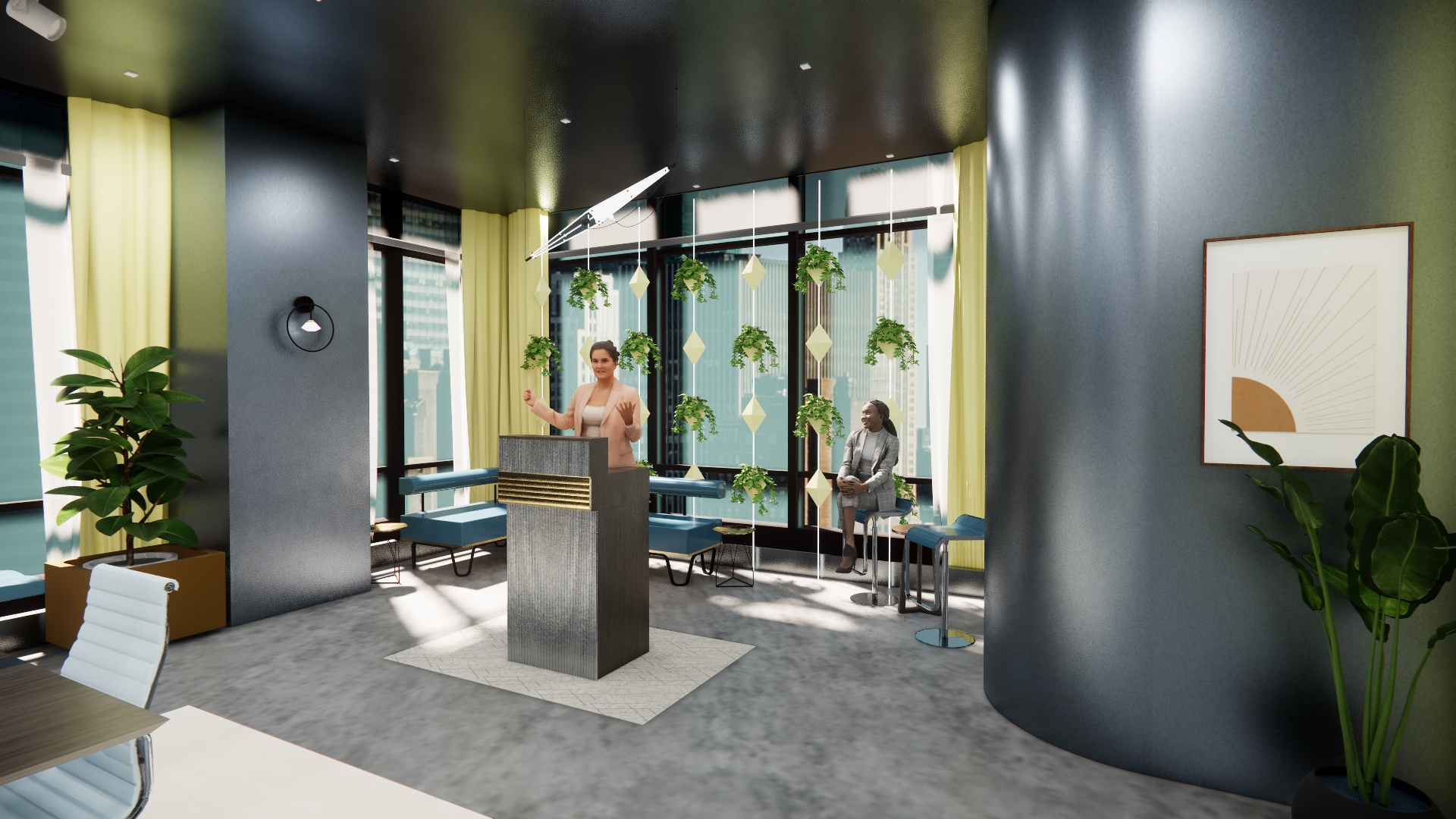 This conference room represents my design work as part of a group project. Each group member was responsible for designing particular areas of a tech firm’s office space occupying a full floor of 731 Lexington Ave in New York City. I created this conference room. As the firm produces solar cell technology, a design that uses natural light as a key element was essential. My spaces focused on flexible uses in ways aligned with the changing nature of office work in 2025.