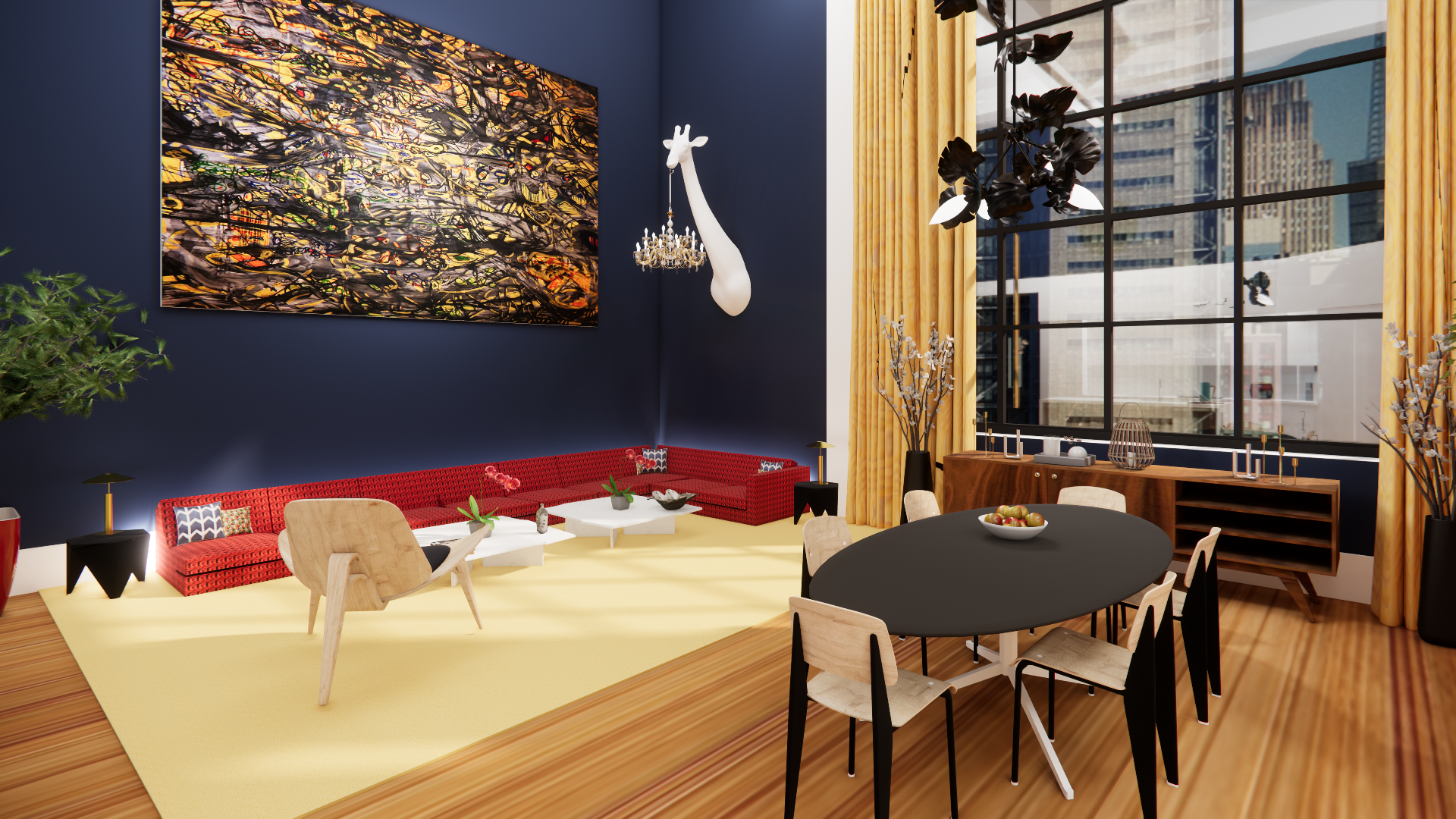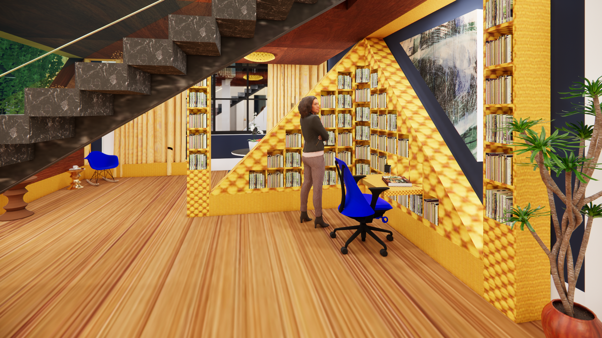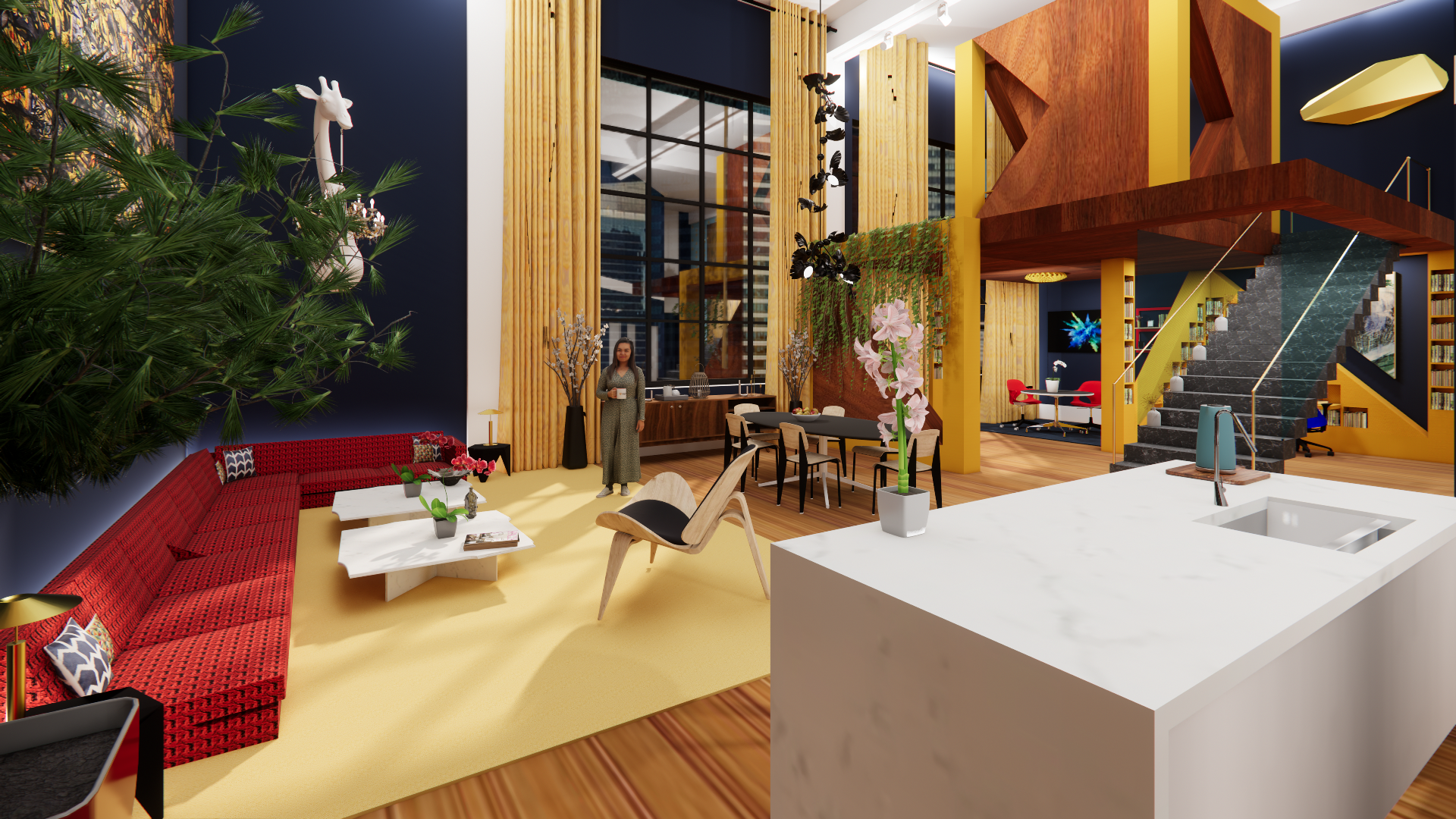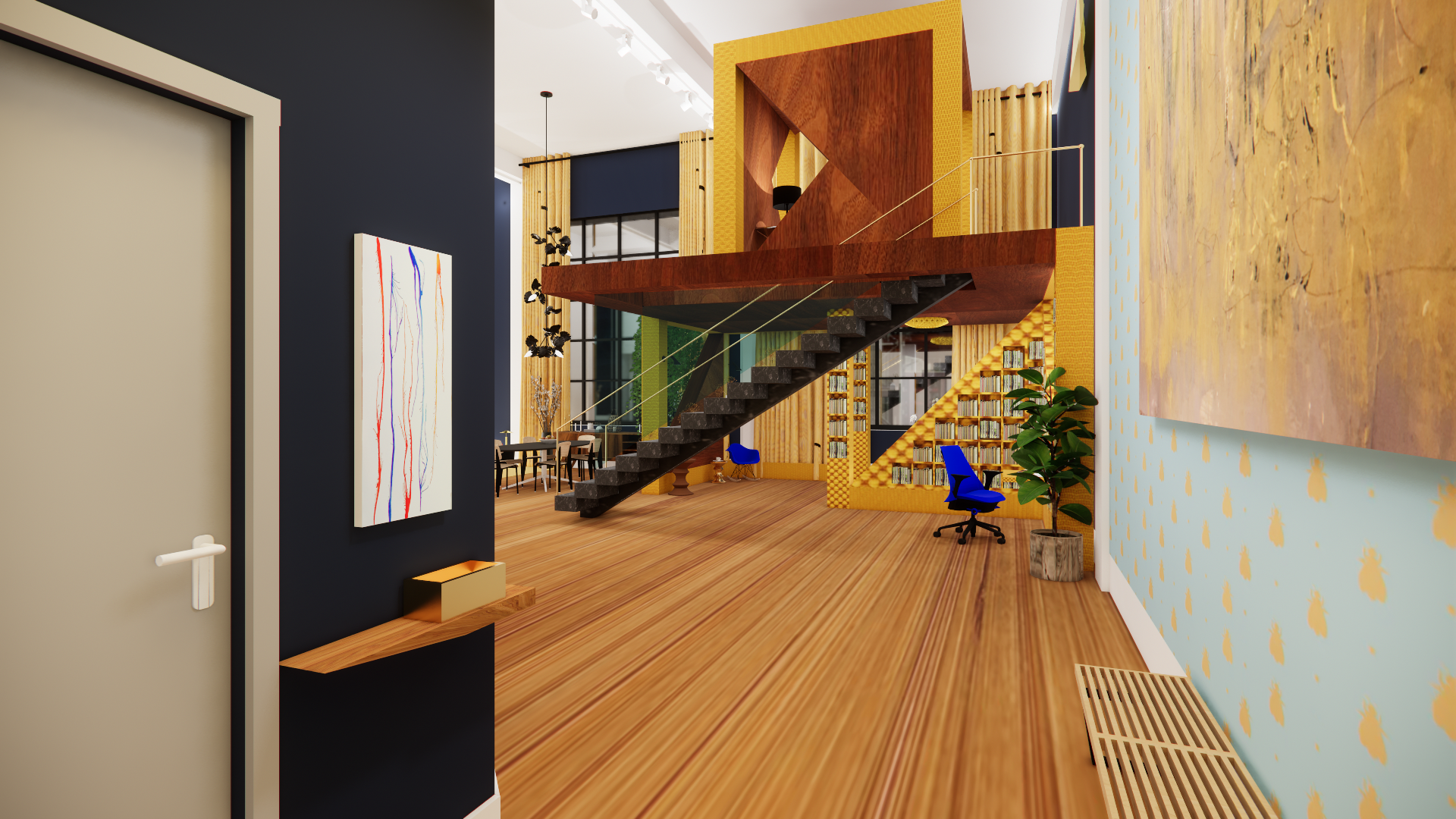 The Cube Loft is a residential project that takes Sol LeWitt’s “Incomplete Open Cubes” series as its starting point. What if, we wondered, one of them was brought to life as a free-standing space inside a loft? How might these endlessly iterative objects be incorporated into someone’s life? Here, the cube is imagined as a workspace for a writer: library and meeting areas are tucked into the spaces below; grand stairs ascend to a lofted writer’s garret above.