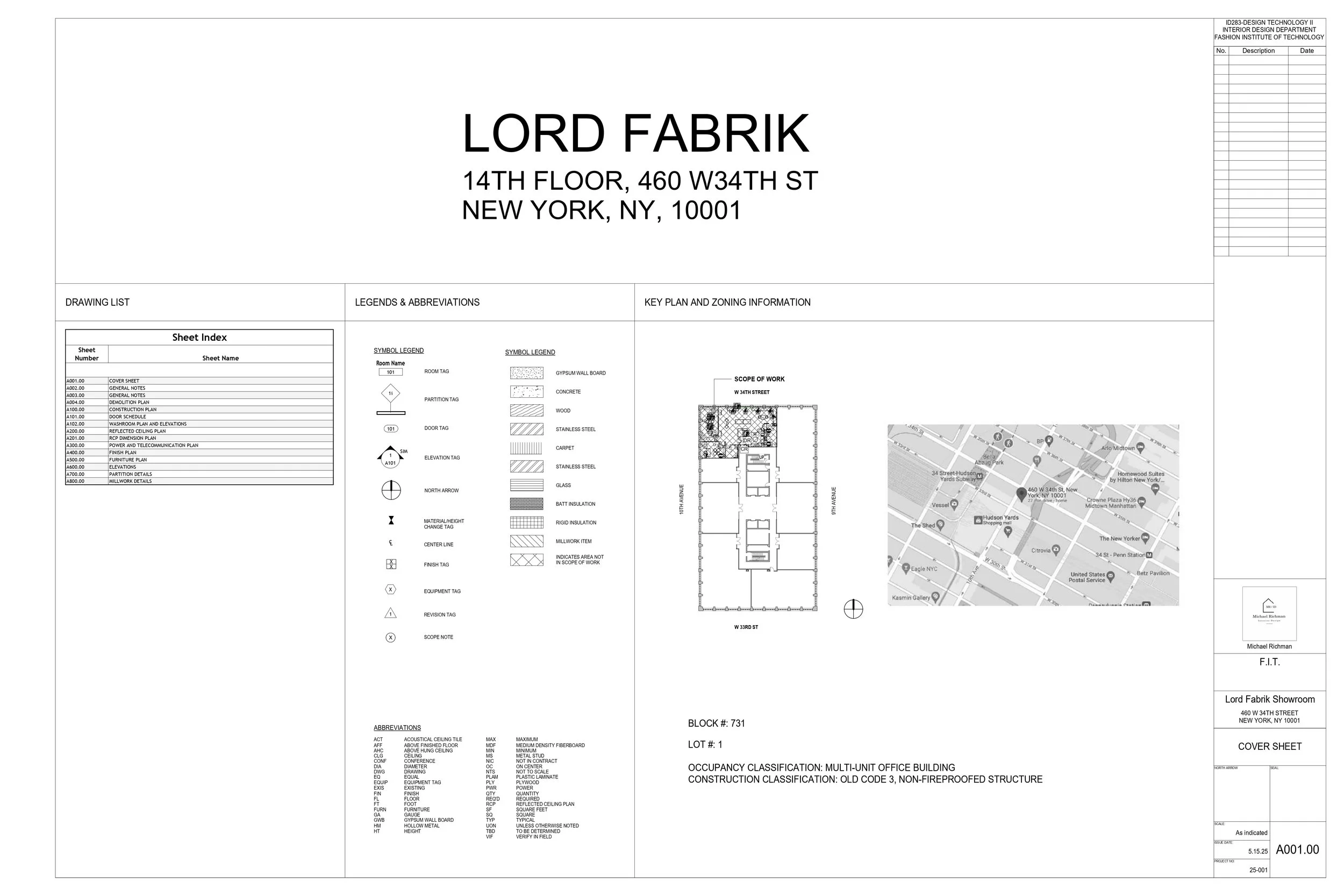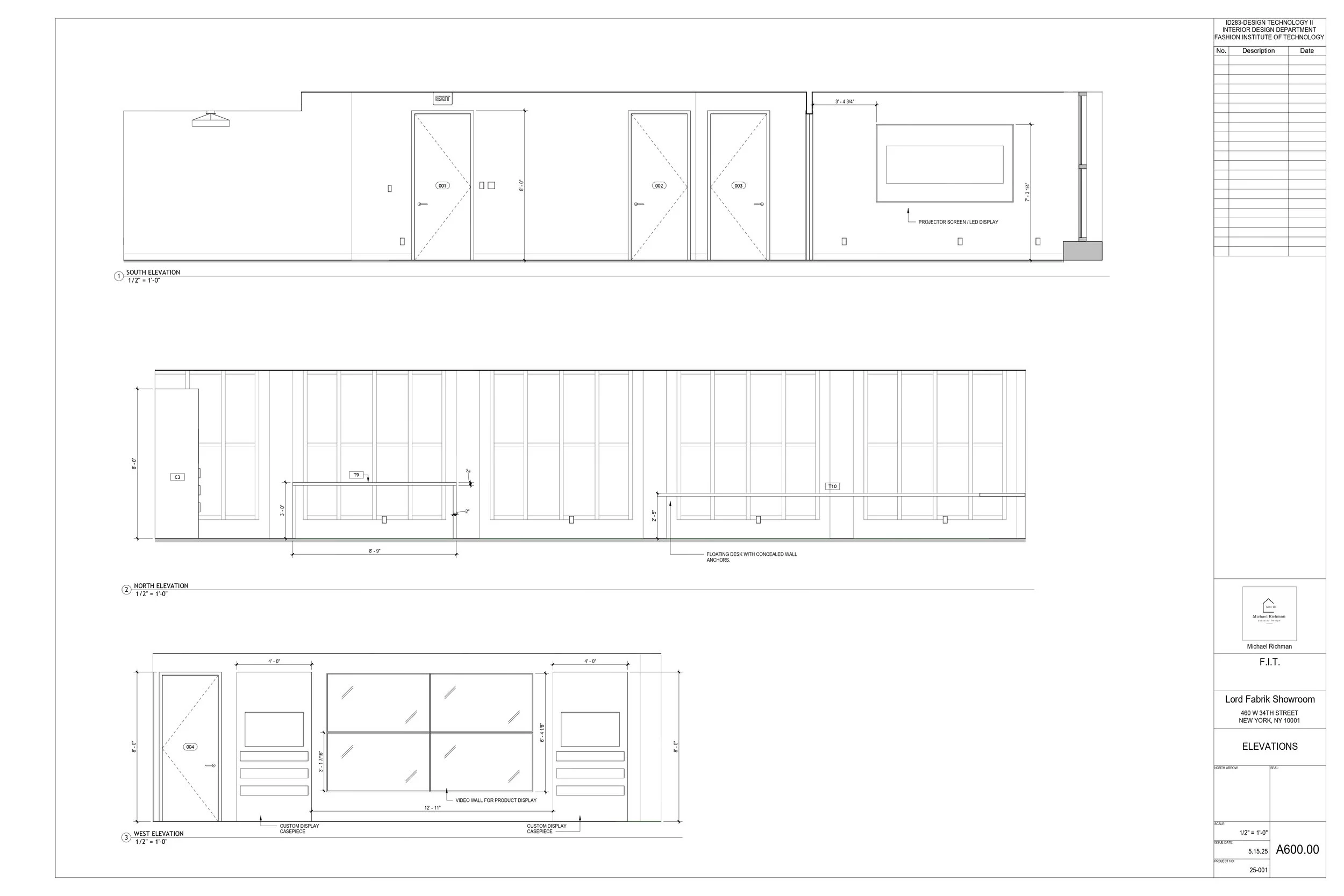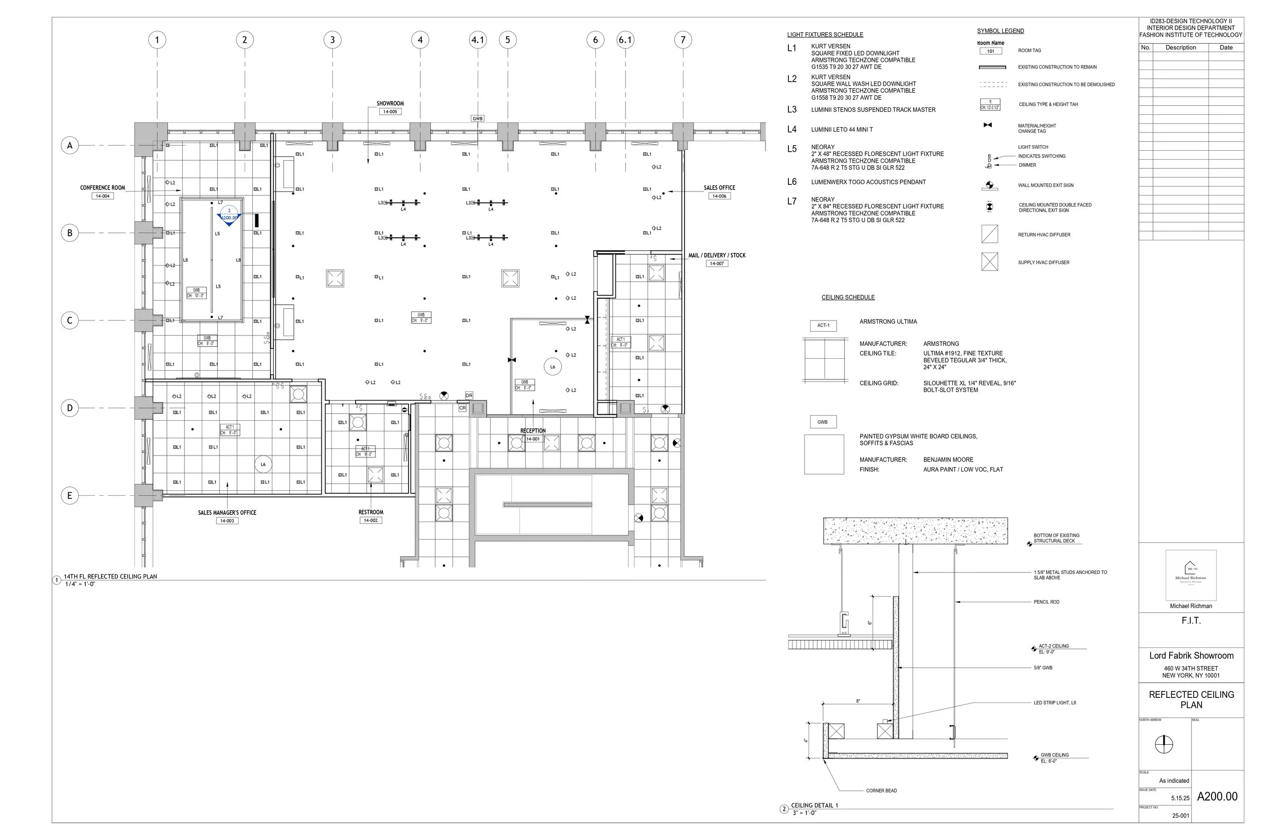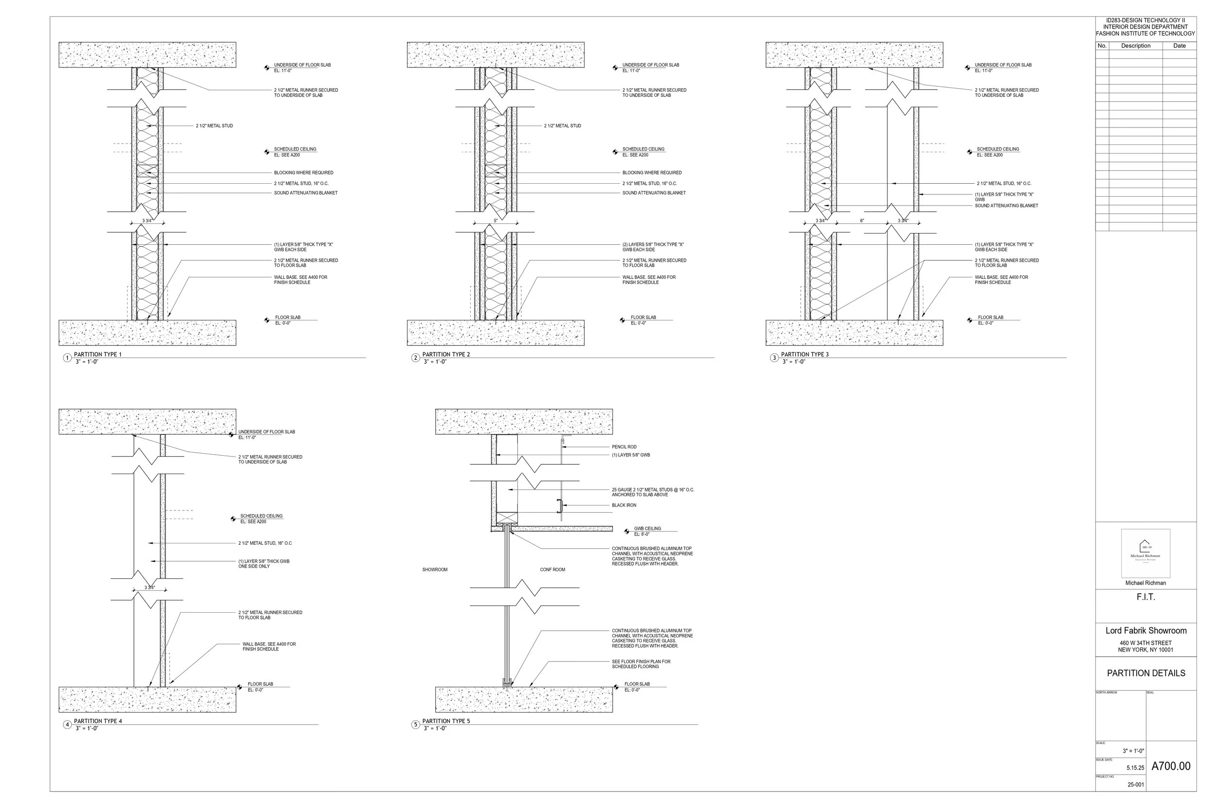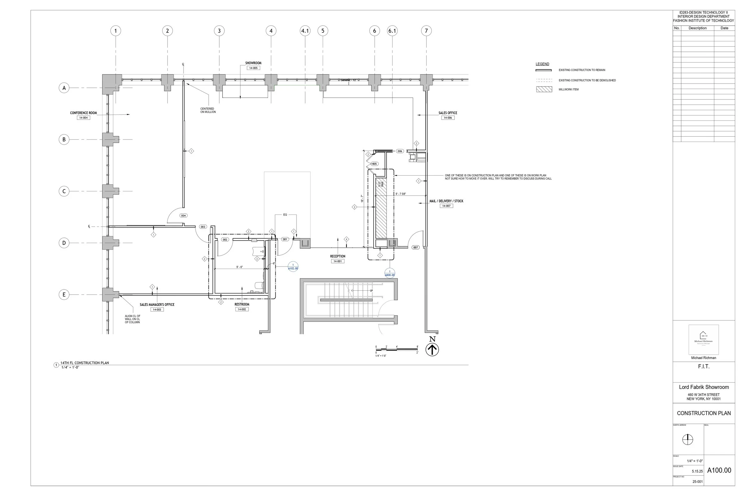 A selection of pages from a full set of construction documents prepared for a fabric showroom. This work also consisted of General Notes, a construction manual, and renderings done with Enscape inside Revit. Additional pages available upon request.